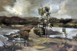 Paesaggio lacustre,olio su tela, cm 78x60, entro cornice.