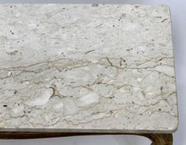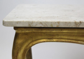 Tavolino basso in legno dorato, XX secolo, piano in marmo bianco, gambe mosse, cm 47x94x45, (segni del tempo).