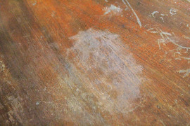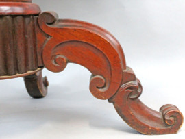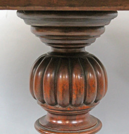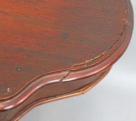 Tavolino da centro a biscotto in mogano, XIX secolo, fusto tornito poggiante su quattro piedi mossi, cm h 70x60x99, (difetti)