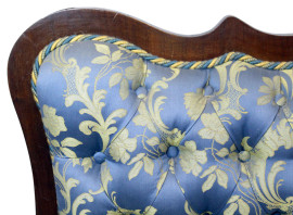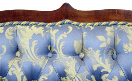 Testata da letto matrimoniale, XIX secolo, lavorazione capitonné, rivestita in tappezzeria azzurra con dettagli dorati, cm h 109,5x188, (segni del tempo).