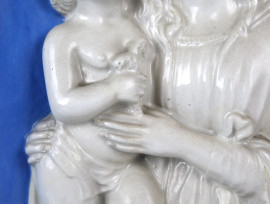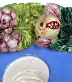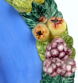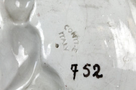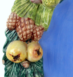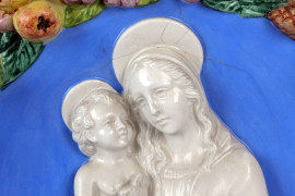 Tondo in ceramica a smalti policromi raffigurante Madonna con Bambino entro ghirlanda di frutta, manifattura E. Conti, XX secolo, diam. 42,5, (restauri)