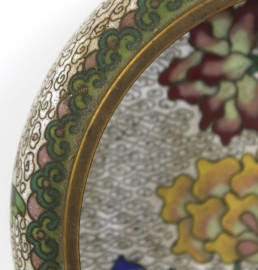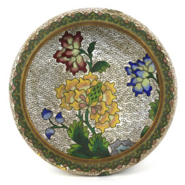 Vaschetta cloisonnè, con decori floreali su fondo bianco, cm 5,5x17, arte orientale, metà XX secolo