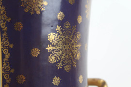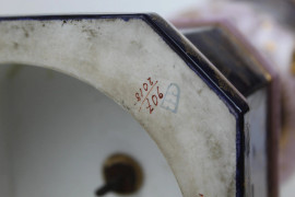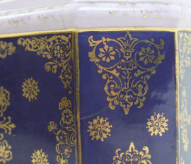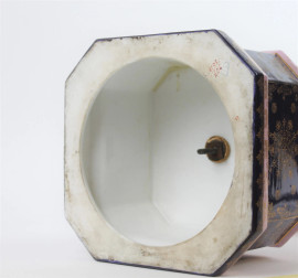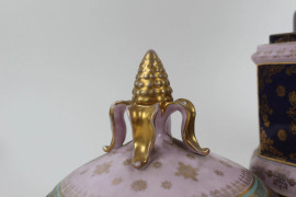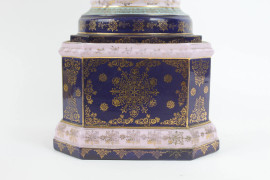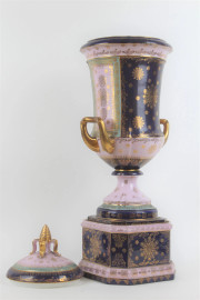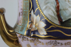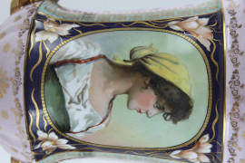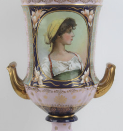 Vaso in porcellana di Vienna, a smalti policromi, con riserva dipinta raffigurante popolana, finiture in oro, marca sotto la base, alt. cm 65, (felature alla base)