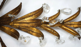 Applique a due luci in ferro battuto e dorato con gocce in cristallo, decori a foggia di foglie e bobeches a motivi floreali, cm h 52, XIX secolo, (difetti e segni del tempo)