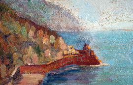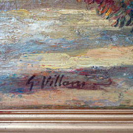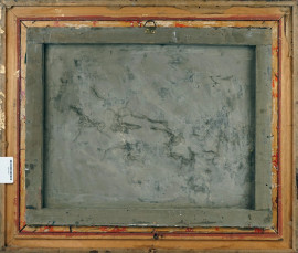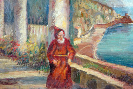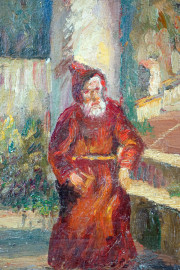 Chiostro con frate, olio su tela, cm 43,5x53,5, firmato, entro cornice.