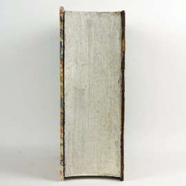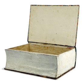 Cofanetto a forma di libro, legno rivestito con carta colorata e laccata, cm h 12x32,5x24,5, XX secolo, (difetti).