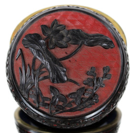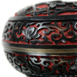 Cofanetto in lacca rossa e nera intagliato a motivi floreali, cm h 7, arte orientale, inizi XX secolo.