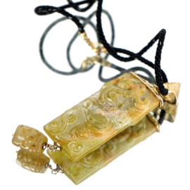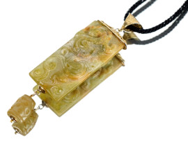 Collana con pendente in giada scolpita, finiture in argento dorato, lunghezza cm 31.