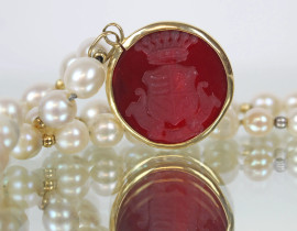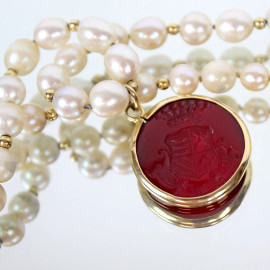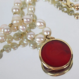 Collana di perle con ciondolo in corniola incisa raffigurante stemma araldico, montatura in oro 18 KT, lunghezza cm 54,5, gr.49,2