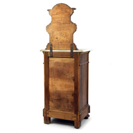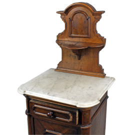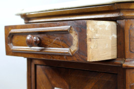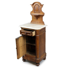Comodino in noce, XIX secolo, piano in marmo con alzata a mensola, fronte ad un cassetto ed uno sportello, cm h 130x52x38,5, (segni del tempo).
