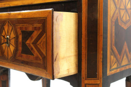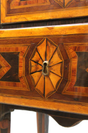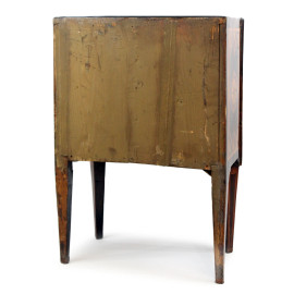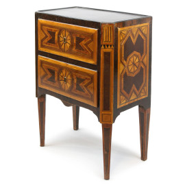 Comodino Luigi XVI lastronato, intarsiato e filettato, particolari ebanizzati, piano di linea rettangolare, fronte a due cassetti, quattro gambe troncopiramidali, cm h 77,5x52,5x31,5, (segni del tempo).
