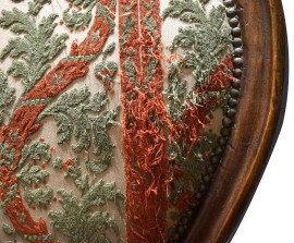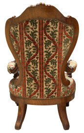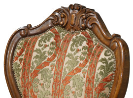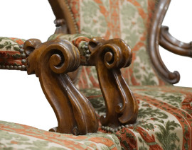 Coppia di poltrone Luigi Filippo in noce, cimasa intagliata a motivi fogoliacei, seduta e schienale rivestiti in tappezzeria verde e rossa, braccioli a ricciolo, gambe mosse, cm h 108, (difetti).