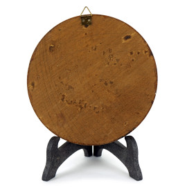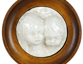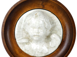 Coppia di tondi raffiguranti volti di cherubini in ceramica craquelé smaltata, diam. cm 11, XX secolo, (difetti).