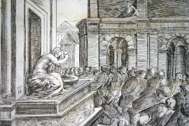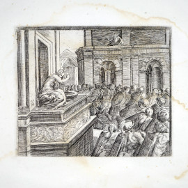 Da Raffaello Sanzio e bottega (1483-1520), Davide s'invaghisce di Batsabea, incisione, cm 33,5x48,5, XX secolo, entro cornice, (macchia sulla carta).