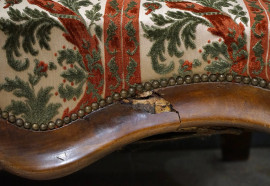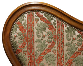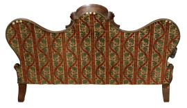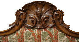 Divano Luigi Filippo in noce, cimasa intagliata a conchiglia, schienale e seduta rivestiti in tappezzeria verde e rossa, braccioli a ricciolo, due piedi leonini, cm h 117x195x74, (difetti).