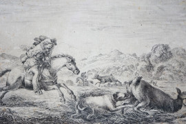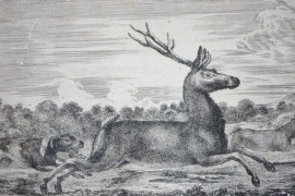 Due acquaforti raffiguranti Caccia al cervo e Cerva fermata da due cani, cm 20x28 , XVII secolo, entro cornici.