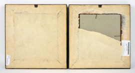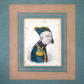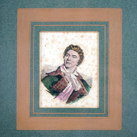 Due antiche stampe acquerellate raffiguranti personaggi francesi, cm 6x5,5 circa, entro cornici, (macchie sulla carta).