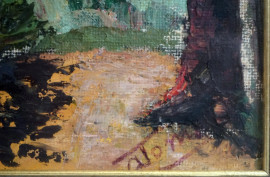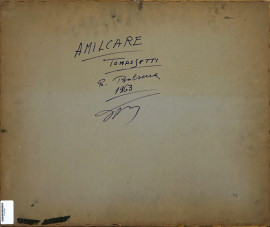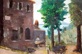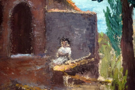 Esterno di casolare con figura, olio su masonite, cm 39,5x51,5 circa, firmato, entro cornice.