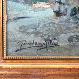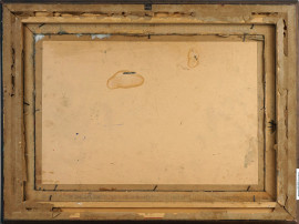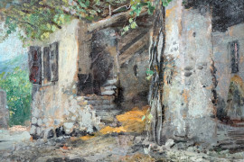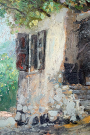 Esterno di casolare, olio su tela riportata su cartone, cm 28x41, firmato, entro cornice.
