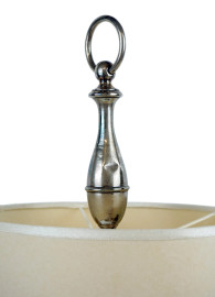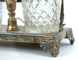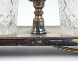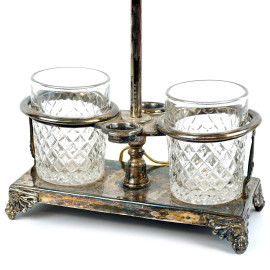 Lampada da tavolo in Sheffield, base ad oliera con coppia di bicchieri in cristallo, cm h 60, XX secolo, (segni del tempo, meccanismo da revisionare).