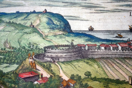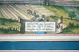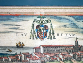 Lauretum, antica incisione acquerellata, cm 17x49, entro cornice.