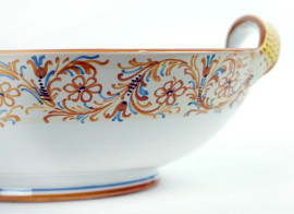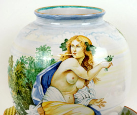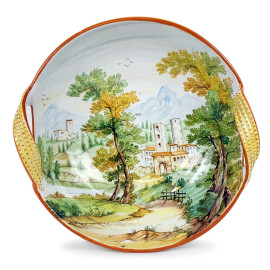 Lotto composto da un vaso ed un centrotavola in ceramica dipinta in policromia, raffiguranti scorcio di paesaggio con architetture e figura femminile, alt. max cm 32, manifatture Paolo Lazzarotti e Chiellidee Ascoli Piceno, XX secolo.