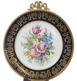 Lotto composto da uno specchio da parete, un vassoio ed un piatto in porcellana con decori floreali policromi, finiture in bronzo, misure max cm 7x50x32, XX secolo, (segni del tempo)