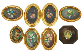 Lotto di dieci miniature dipinte ad olio raffiguranti fiori, supporti ed epoche diverse, misure max cm 17x12,5 circa, entro cornici, (segni del tempo).