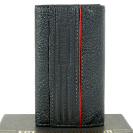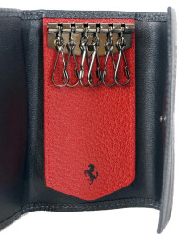 Lotto di due astucci portachiavi in pelle e similpelle nera marcati Alain Delon e Ferrari Formula, uno entro custodia originale, misure max cm 12x6, XX secolo, (lievi segni di utilizzo).
