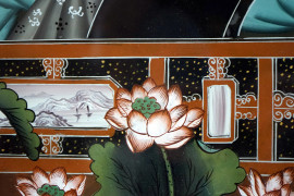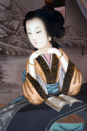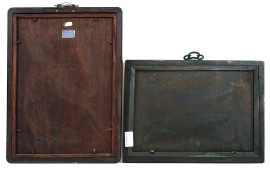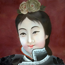 Lotto di due dipinti sotto vetro raffiguranti personaggi orientali, misure max cm 55x39,5, Cina, XX secolo.