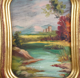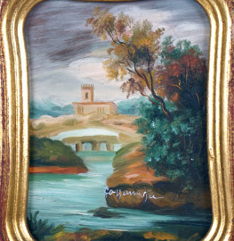 Lotto di otto miniature dipinte ad olio raffiguranti scorci di paesaggi, supporti diversi, diam. max cm 11,5, epoche diverse, (difetti).