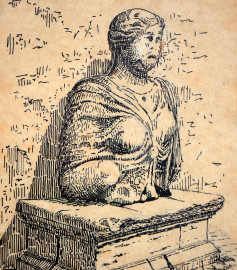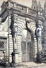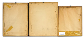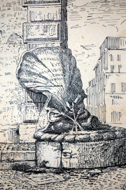 Lotto di tre disegni a china su carta raffiguranti scultura di Madama Lucrezia, ingresso di Villa Celimontana e Fontana delle Api di G.L.Bernini, misure max cm 22,5x19,5, siglati e firmati, entro cornici, (difetti).