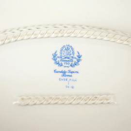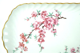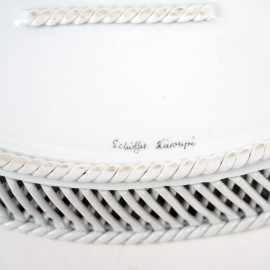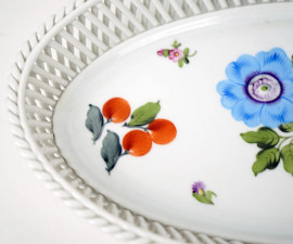 Lotto di tre oggetti in porcellana, composto da un cestino traforato con manico e due vassoi con dettagli di frutta e fiori dipinti in policromia, lunghezza max cm 39, manifatture ed epoche diverse, (segni del tempo).