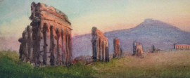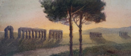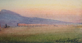 Lotto di tre paesaggi raffiguranti la campagna romana, acquarelli su carta, cm 8x27, firmati, entro cornici.