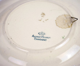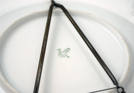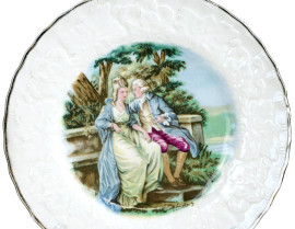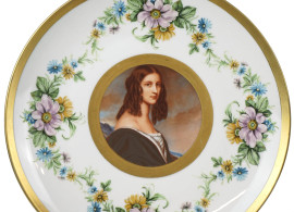 Lotto di tre piatti in porcellana policroma, di cui due con riserve raffiguranti ritratto di Freiin Von Gumppenberg e scena galante ed uno a fantasia di finto marmo, misure max cm 32x32,5, manifatture diverse, XIX-XX secolo, (segni del tempo).