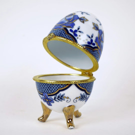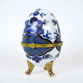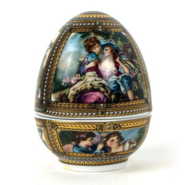Lotto di tre uova in porcellana, decori policromi di fiori e scene galanti, finiture in metallo dorato, alt. max cm 11, epoche diverse, (segni del tempo).