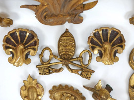 Lotto di tredici fregi in legno dorato ed intagliato, lunghezza max cm 55, epoche diverse, (difetti).