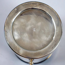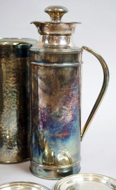 Lotto di vari oggetti in Sheffield, composto da una ciotolina, un versatoio, dodici sottobicchieri e quattro secchielli, alt. max cm 30, XX secolo, (segni del tempo).