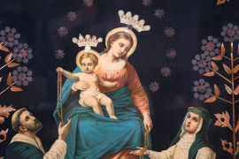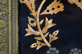 Madonna del Rosario, collage di varie applicazioni su tessuto, cm 67x54, XX secolo, entro cornice, (difetti).