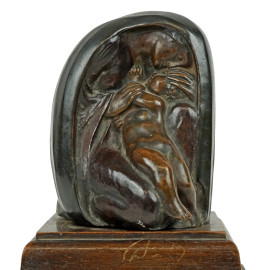 Maternità, scultura in bronzo, cm h 16, poggiante su base in legno, XX secolo, (lievi difetti).
