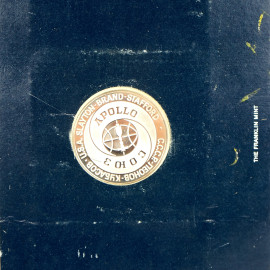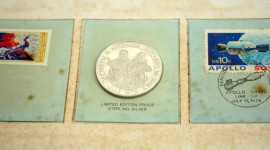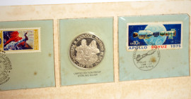 Medaglia commemorativa "Missione Apollo" 1975 in edizione limitata, completa di due francobolli, ingombro tot cm 11,5x25, (segni del tempo).