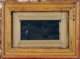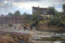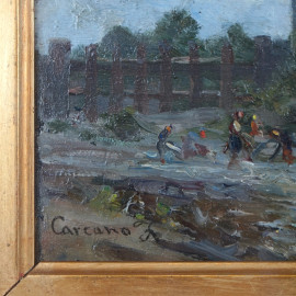 Paesaggio con case e figure, olio su tavola, cm 14x24, firmato, entro cornice.