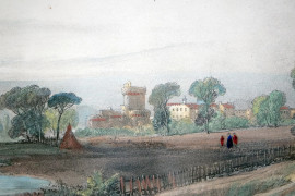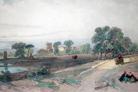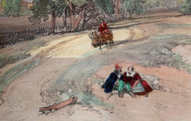 Paesaggio con figure, stampa acquerellata, cm 50,5x60, siglata, entro cornice.