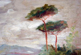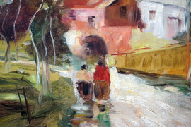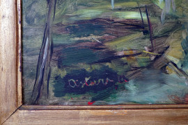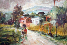 Paesaggio con strada e figure, olio su cartone, cm 40x50, firmato Asturi, entro cornice.