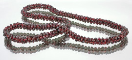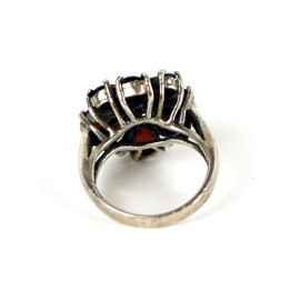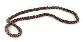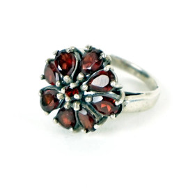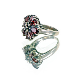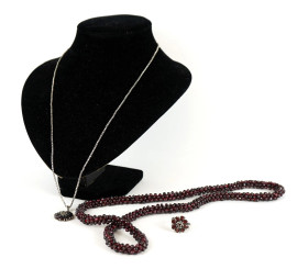 Parure in argento e granati, composto da una collana, una catenina con ciondolo ed un anello a foggia di fiore, lunghezza max c m 34,5.