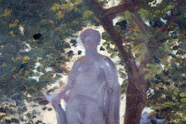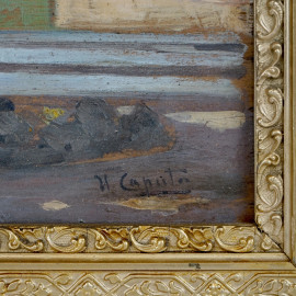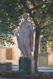 Piazza con scultura, olio su tavola, cm 36x26, firmato, entro cornice.