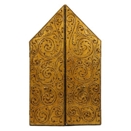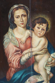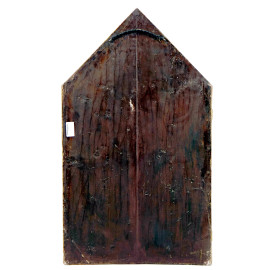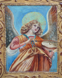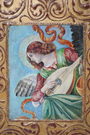 Pittore fiorentino del XX secolo, Trittico in legno scolpito e dorato con tre riquadri raffiguranti Madonna con Bambino ed angeli musicanti, cm h 101x120, (segni del tempo).