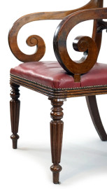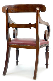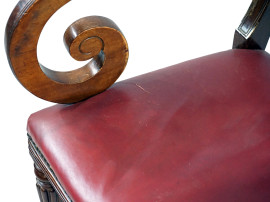 Poltrona in mogano, XIX secolo, schienale a giorno con cartella intagliata, braccioli a ricciolo, seduta in pelle bordeaux, gambe anteriori scanalate, posteriori a sciabola, cm h 90, (segni del tempo).