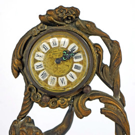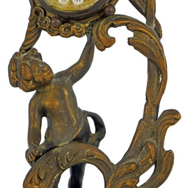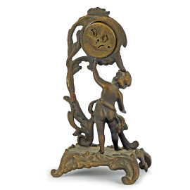 Porta orologio in metallo dorato sorretto da fanciullo, cm h 27, inizi XX secolo, (orologio non pertinente, difetti).