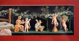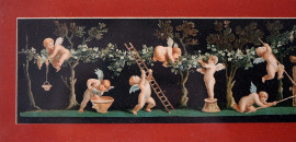 Putti vendemmiatori, stampa a colori, cm 9x42, inizi XX secolo, entro cornice.
